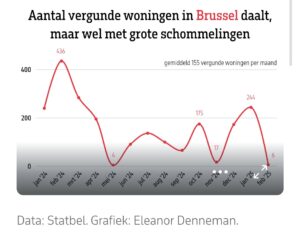 “Er is sinds 2021 sprake van een structurele, zware daling. Daarnaast ligt het aantal uitgereikte bouwvergunningen verhoudingsgewijs ook een stuk lager dan in de Vlaamse steden. In heel België zien we dat er minder woningen gebouwd en vergund worden, maar in Brussel zien we echt een zeer zware afremming.”